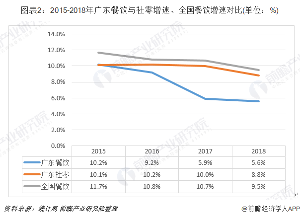 2018年,广东全省实现餐饮收入总额达3884.59亿元,然而,同比增速仅为5.6%,增幅同比下降0.3个百分点;广东餐饮业增速自2015年的10.2%出现下滑拐点,同比增速已连续四年回落。全国餐饮收入42716亿元,同比增长9.5%,较上年下降1.2个百分点。广东餐饮业2018年增速远低于全国平均水平3.9个百分点,广东餐饮占全国市场的份额也从9.3%下降到9.1%。