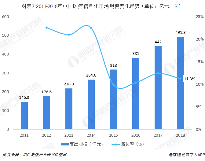 2011-2018年,我国医疗信息化行业市场规模逐年递增,且增速保持在10%以上的较高水平。根据IDC最新发布的报告显示,2018年我国医疗行业信息化花费为491.8亿元,同比增长11.3%。