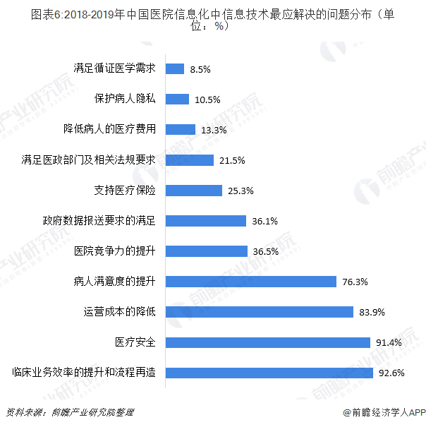 2019年1月,国务院发布《国务院办公厅关于加强三级公立医院绩效考核工作的意见》,提出以医疗质量、运营效率、持续发展、满意度评价四个方面共55个指标作为考核的主要内容, 加强对医院的主动控费和提高医患满意度的考核。未来绩效考核结果将作为公立医院发展规划、重大项目立项、财政投入、经费核拨、绩效工资总量核定、医保政策调整的重要依据,并将责任落实到医院领导班子上,以此增强医院的主动性。根据CHIMA《2018-2019年度中国医院信息化情况调查》的结果,信息技术最应解决的问题排在前三位的分别是临床业务效率的提升和流程再造、医疗安全以及运营成本的降低。