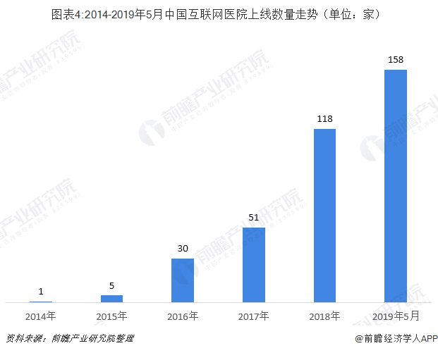 根据卫健委的统计,截至2019年5月,全国目前已有158家互联网医院,从数量上来讲,互联网医院进入快速扩张阶段。价格上,单体互联网医院的建设在100万-800万元不等。