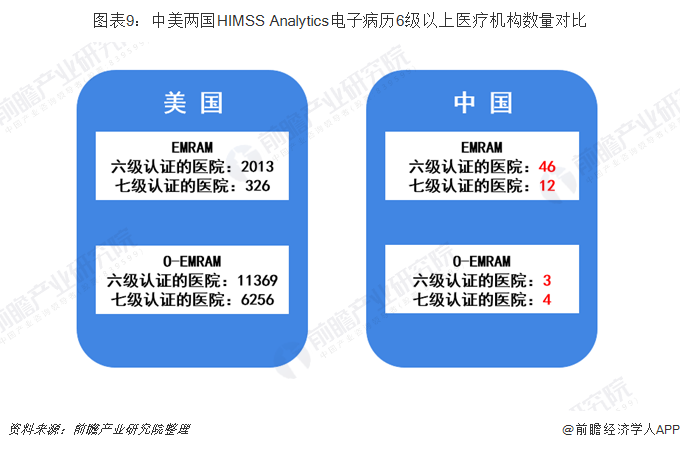 HIMSS Analytics2019年5月的最新数据显示,美国获得HIMSS电子病历(EMRAM)六级认证的医院已有2013家,获得HIMSS电子病历(EMRAM)七级认证的医院已有326家;获得HIMSS电子病历(O-EMRAM)六级认证的医院已有11369家,获得HIMSS电子病历(O-EMRAM)七级认证的医院已有6256家;相比美国,中国HIMSS电子病历6级以上医疗机构数量远少于美国。