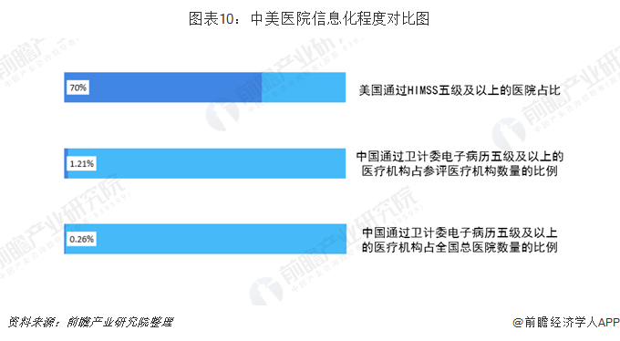而相较中国,美国在2017年底通过HIMSS五级以上的医院就已高达70%,即每10家医院中就有7家医院的信息化程度达到HIMSS电子病历5-7级。