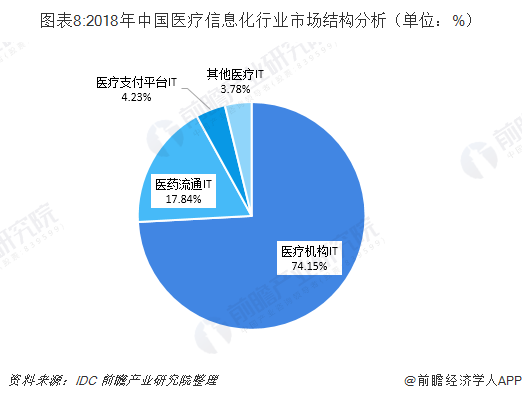 市场结构方面,医疗机构IT系统支出占比最大。根据IDC 2019年发布的最新数据,2018年国内医疗机构 IT系统花费364.67亿元,占74.15%,远超医疗支付平台IT、医药流通IT和其他医疗IT的花费。