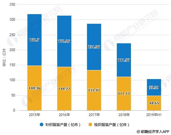 2015-2019年H1中国规模以上服装企业细分领域服装产量统计及增长情况