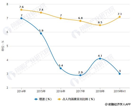 2014-2019年H1全国居民人均衣着消费支出增长及占人均消费支出比例统计情况