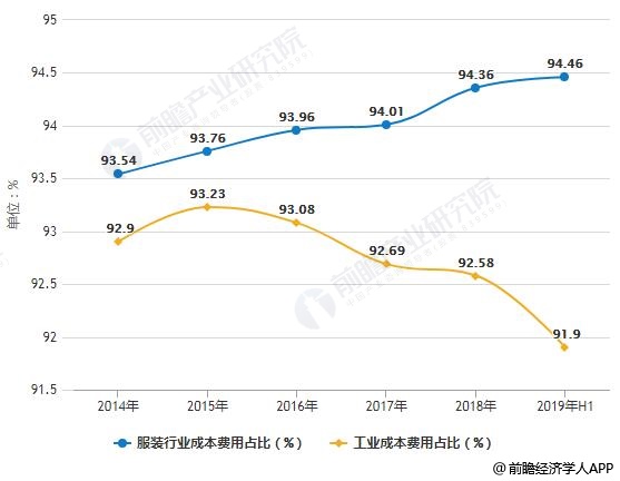 由于用工、融资、税收、原材料、能源等成本费用的持续增长,企业综合运营成本不断提升。据国家统计局数据显示,2019年1-6月,我国规模以上服装企业累计成本费用同比增长2.04%,增长幅度仅比营业收入增幅略低0.11个百分点。从成本费用占主营业务收入的比重变化来看,全国规模以上工业企业的平均水平逐年下降,而服装行业的该项比重呈现了不断上升的态势,成本费用的快速上涨进一步挤压了服装企业的利润空间。
