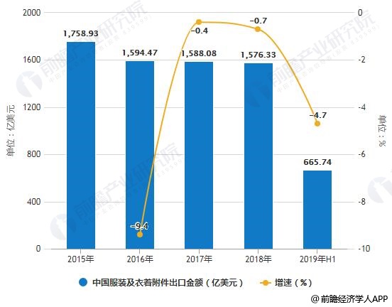 2015-2019年中国服装及衣着附件出口金额统计及增长情况