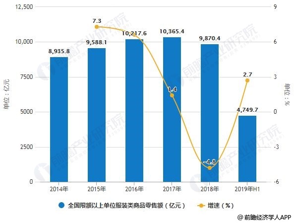 2014-2019年H1全国限额以上单位服装类商品零售额统计及增长情况