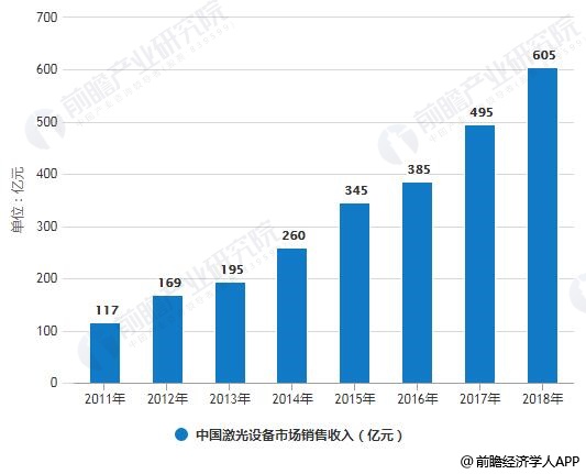 中国激光市场整体起步较晚,但随着国内企业突破激光器核心技术,实现激光器和核心光学器件的规模化生产,推动光学原材料成本下降,国内激光设备的容量呈现爆发式增长。2018年中国激光设备销售收入达到605亿元,同比增长22.2%。