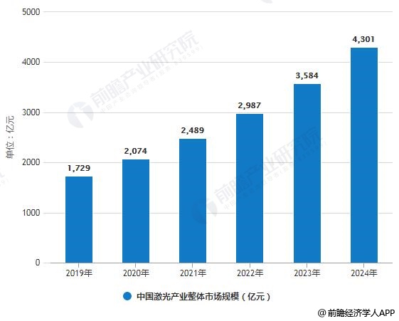 随着我国激光应用领域的不断扩展以及应用深度的加大,未来行业需求前景看好,预计行业规模增速在20%左右,预计2024年我国激光产业(上中下游)整体市场规模将达到4301亿元。