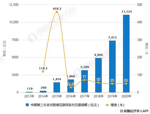 2013-2020年中国第三方支付跨境互联网支付交易规模统计及增长情况预测