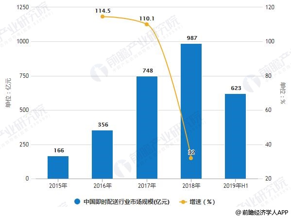 相关统计数据显示,2015-2018年,我国即时配送行业市场规模呈现逐年增长趋势,其中2018年行业市场规模达到987亿元,同比增长32%;2019年上半年我国即时配送行业市场规模达到623亿元。