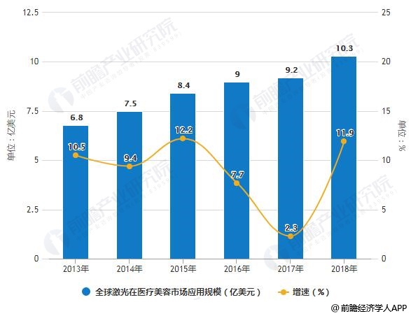 从全球市场来看,近几年激光在医疗市场的应用规模呈逐年上升趋势,2018年,全球激光器在全球医疗美容市场应用规模为10.3亿美元,同比增长11.9%。