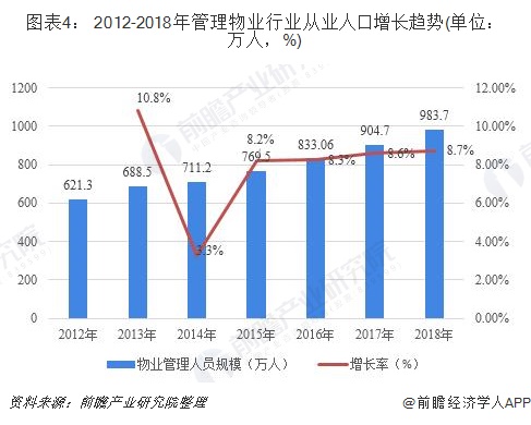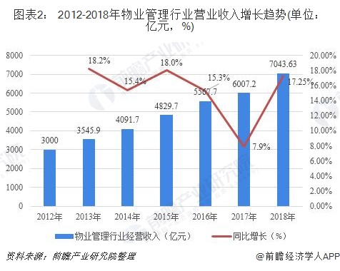 2018年,物业管理行业经营收入为7043.63亿元,同比增长17.25%;管理物业总面积达279.3亿平方米,同比增长13.2%;从业人口接近1000万人。总体上,我国物业管理行业发展呈现不断提升的态势。