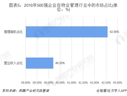2018年,500强企业营业收入2831.76亿元,占物业管理行业营业总收入的40.2%;500强企业物业管理项目70403个,管理面积118.87亿平方米,占2018年物业行业管理总面积的42.56%。住宅物业是物业服务企业主要的布局业态,500强95.6%的企业布局了该业态;紧随其后的是写字楼物业和商业物业,500强中分别有93%和74%的企业布局了上述两种业态。这显示出物业管理行业的集中度加快提升,头部企业强者恒强的趋势越来越明显。前瞻产业研究院认为,物业管理行业目前的集中度仍有较大提升空间,未来头部企业规模将越来越大,将会进一步提升管理面积和规模。