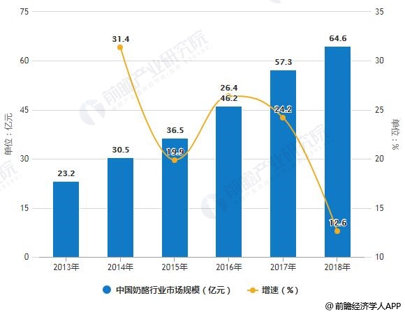2013-2018年中国奶酪行业市场规模(表观消费量*单价)统计及增长情况