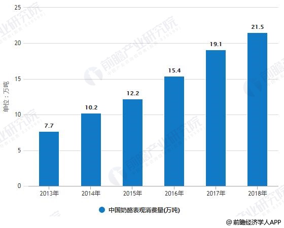 2013-2018年中国奶酪表观消费量统计情况
