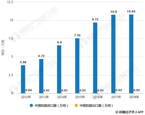 2010-2018年中国奶酪进出口量统计情况