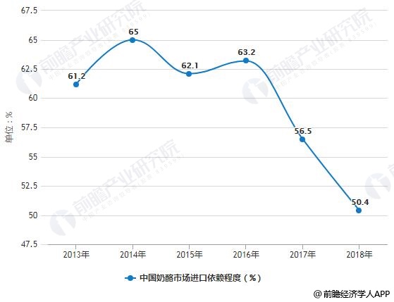 2013-2018年中国奶酪市场进口依赖程度变化情况