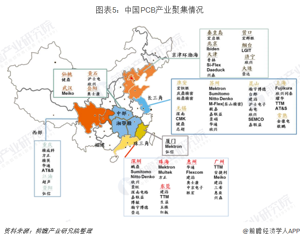 PCB产品作为基础电子元件,其产业多围绕下游产业集中地区配套建设。目前中国大陆约有一千五百家PCB企业,主要分布在珠三角、长三角和环渤海等电子行业集中度高、对基础元件需求量大并具备良好运输条件和水、电条件的区域。