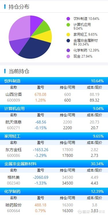 我今天的持仓有山西汾酒,航天信息,格林美,东方金钰,哈药股份。
