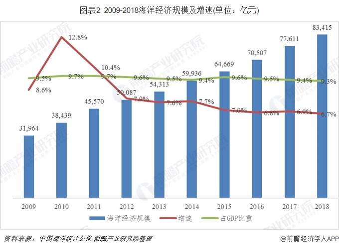 2018年全国海洋生产总值83415亿元,比上年增长6.7%,海洋生产总值占国内生产总值的比重为9.3%。2009-2018年,我国海洋经济生产总值由31964亿元增至83415亿元,年复合增长率达6.73%左右,占GDP比重随呈现出轻微的下降趋势。值得注意的是,自2015年来,我国海洋经济增速及占GDP比重均处于相对稳定的状态,分别稳定在7%与9.5%左右,海洋经济在经历2004-2006及2010年前后的高速增长后,目前正保持与GDP相对同步的增速进入较为稳定的增长阶段。