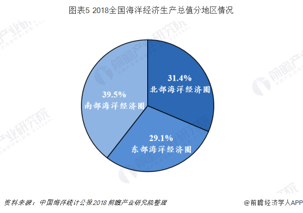 2018年,北部海洋经济圈海洋生产总值26219亿元,比上年名义增长7.0%,占全国海洋生产总值的比重为31.4%;东部海洋经济圈海洋生产总值24261亿元,比上年名义增长8.0%,占全国海洋生产总值的比重为29.1%;南部海洋经济圈海洋生产总值32934亿元,比上年名义增长10.6%,占全国海洋生产总值的比重为39.5%。