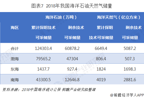其中,截止2017年底,我国海洋石油累计探明技术可采储量为124303.4万吨,剩余技术可采储量60878.2万吨;海洋天然气累计探明技术可采储量为6649.4亿立方米,剩余技术可采储量5078.2亿立方米。其中,渤海海区海洋石油资源最为丰富,占到总剩余技术可采储量的75%以上;南海、东海海区天然气资源较为丰富,分别占到目前剩余技术可采量的56%、33%左右。