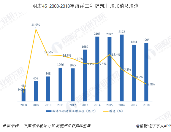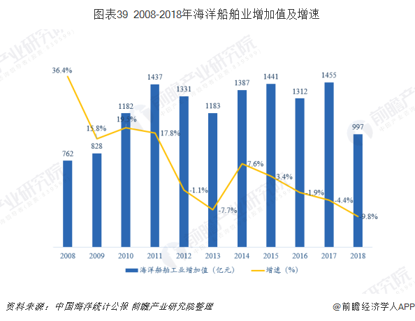2018年海洋船舶工业增加值为997亿元,行业受全球经济贸易发展趋势影响较大,2008年-2018年间增长出现较大波动。