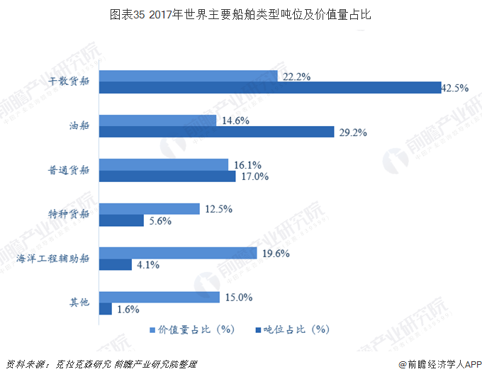 在价值占比方面,由于海洋工程辅助船及特种货船(化学品船和LNG 船等)是技术含量高,单体价值大的船种,其价值量占比分别为19.6%和12.5%,远高于其吨位占比;普通货船价值量占比17.0%,接近吨位占比16.1%;干散货船和油船由于技术含量相对较低,其价值量占比远低于其吨位占比,价值量占比分别为22.2%和14.6%。