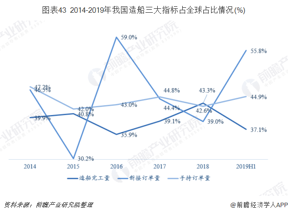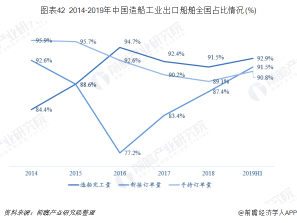 近年来,我国船企利用国际航运市场小幅上涨,新船市场持续活跃的契机,积极开拓市场。2019年上半年,我国出口船舶分别占全国造船完工量、新接订单量、手持订单量的92.9%、91.5%和90.8%。