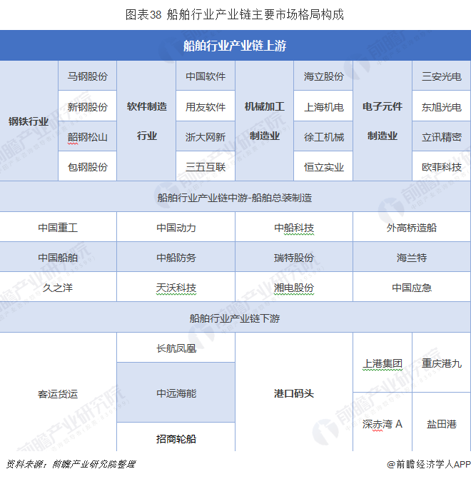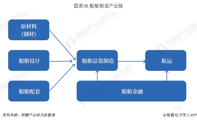 船舶产业链包括产业上游的原材料、船舶设计、船舶配套等企业,产业中游负责船舶总装的造船厂,以及产业下游的航运公司或租赁公司。其中,原材料主要是指钢材、合金材料以及特殊材料等;船舶设计可分为基础设计、详细设计等;船舶配套较为复杂,可分为船舶动力系统、船用电力电气系统、甲板机械、船用舾装设备、船用通信导航系统等。