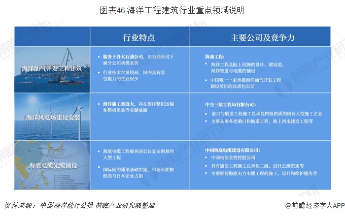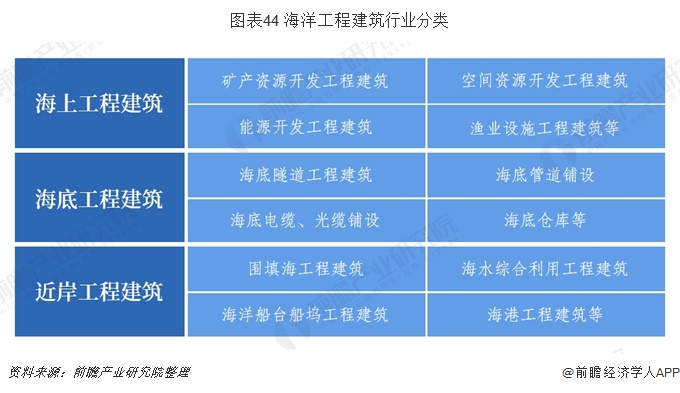 海洋工程建筑涉及与资源开发利用相关、与产业发展相关及与基础设施类海洋工程建筑。其中与资源开发利用包括矿产资源、能源及空间资源开发,包括海洋油气开发所需的工程平台设计、建造、安装、调试,海上风电建设安装,跨海大桥建设等。与产业相关的海洋工程建筑涉及海洋渔业、海水综合利用、海洋船台船坞建设及海底电缆铺设等领域。基础设施类海洋工程涉及海底隧道、海港、海洋防护性工程建筑等。