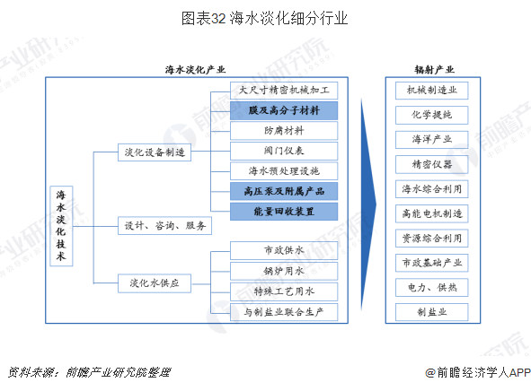 在海水淡化总成本构成中,电耗成本占比最大,占比44%左右,其次是设备成本,包括滤芯、淡化膜更新和设备折旧摊销,设备装置占海水淡化总成本的40%左右,而国产设备比进口设备平均低30%左右,可见海水淡化总体成本下降还存在较大的空间,设备国产化是产业发展的关键。从产业链角度看,又以急需实现进口替代的膜、高压泵和能量回收装置最为核心。