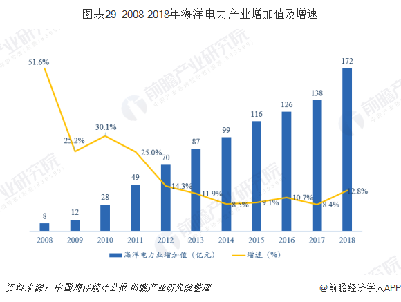 海洋电力业利用海洋能进行电力生产活动,包含海上风电、潮汐发电、海洋温差发电、波浪能发电、海流发电和海水盐浓度差发电等形式,属于海洋新兴产业,为海洋经济的发展注入了动力。2008-2018年鉴海洋电力产业规模由8亿元增至172亿元,年复合增长率达35.9%,为海洋经济中增速最快的行业。