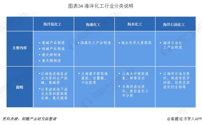 海洋化工业指以海盐、溴素、钾、镁及海洋藻类等直接从海水中提取的物质作为原料进行的一次加工产品的生产,包括烧碱、纯碱以及其他碱类的生产;还包括以制盐副产物为原料进行的氯化钾和硫酸钾的生产;或溴素加工产品以及碘等其他元素的加工产品的生产。