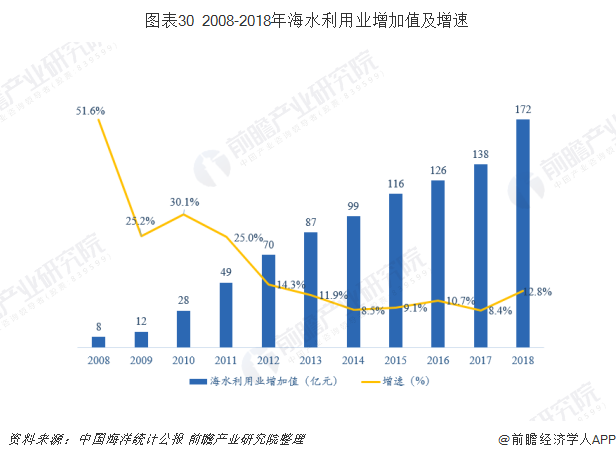 海水利用作为我国重要的海洋新兴产业,2008年-2018年海水利用业年复合增长率达7.8%。海水直接利用和海水淡化是海水利用的主要形式。海水直接利用包括直接用海水为冷却介质、海水冲厕、海水消防、用海水灌溉耐碱农作物等,通常限于临海城市使用,无深加工难度。而海水淡化对缓解我国水资源短缺的矛盾意义重大,发展前景广阔。