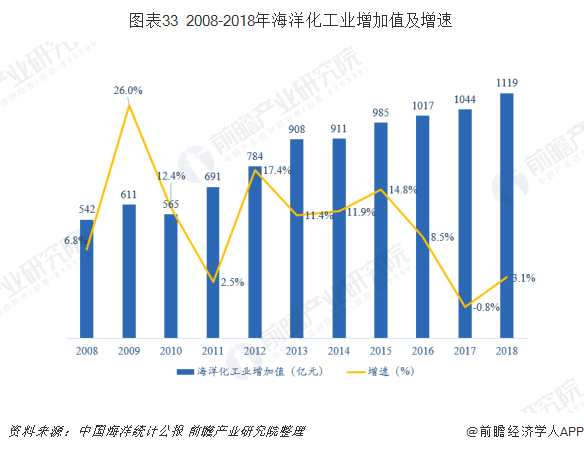 海洋化工业产品广泛应用于建材、军工、石油等领域,是海洋高耗能产业。尽管2008年-2018年海洋化工业实现产能快速增长,但受国家节能减排政策影响,近年来增长速度有所放缓。