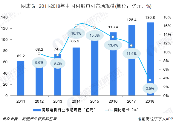 通过测算,2018年,下游市场需求对伺服电机市场增长贡献率为3.5%左右,按此增速,2018年,中国伺服电机的市场规模为130.8亿元。