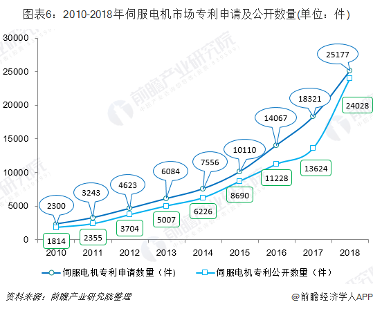 2010年以来,中国企业在伺服电机领域研发投入整体呈现上升趋势,相关专利申请及公开数量实现稳定增长。通过SooPAT专利网通过关键字“伺服电机”查询行业专利数量,2018年,伺服电机行业相关专利申请数量达到25177件,同比增长37.4%,专利公开数量为24028件,同比增长76.4%。