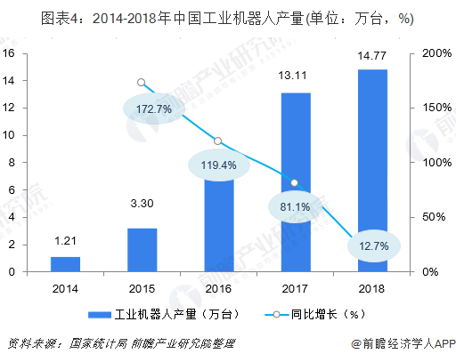 机器人、包装机械及医疗设备市场则保持较快增长,带动伺服电机需求市场增长。根据国家统计局数据,2018年,中国工业机器人产量为14.77万台,同比增长12.7%,根据中国电子学会数据,2018年中国服务机器人市场增长约为43.9%,2018年整体机器人市场增速在22%左右。