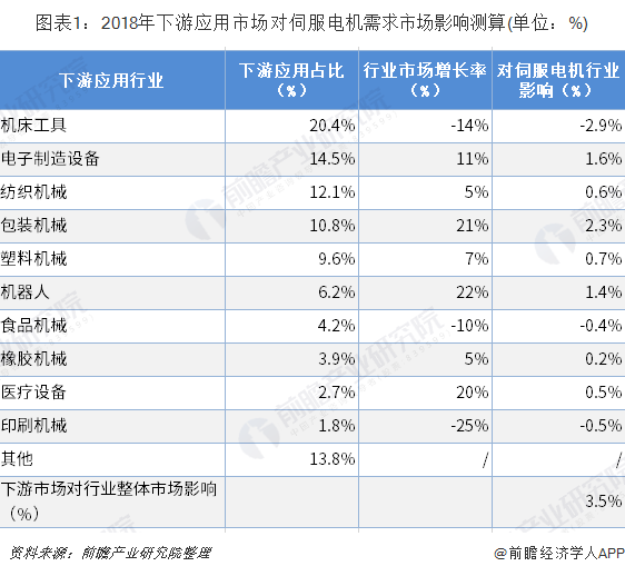 2018年,伺服电机的下游应用市场包括机床工具(20.4%)、电子制造设备(14.5%)、纺织机械(12.1%)、包装机械(10.8%)、机器人(6.2%)等。