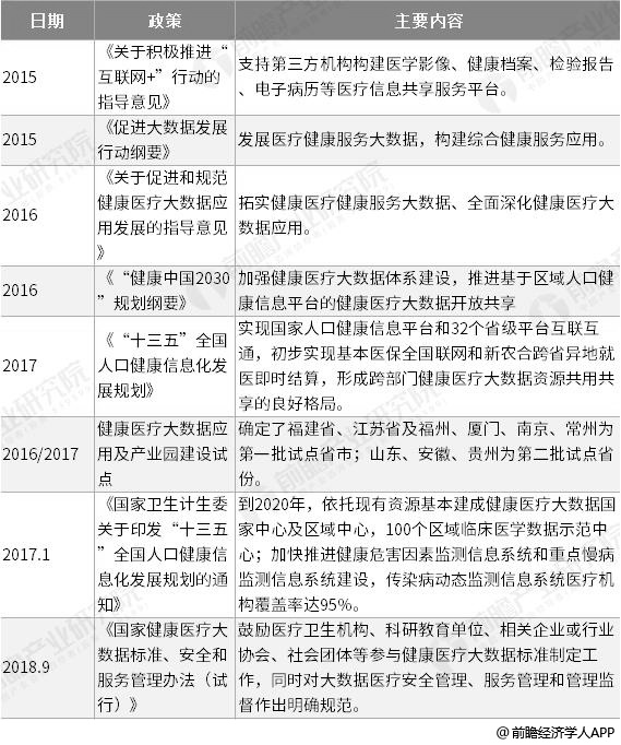 2015 年8月国务院发布了《促进大数据发展行动纲要》,指出发展医疗健康服务大数据,构建综合健康服务应用。