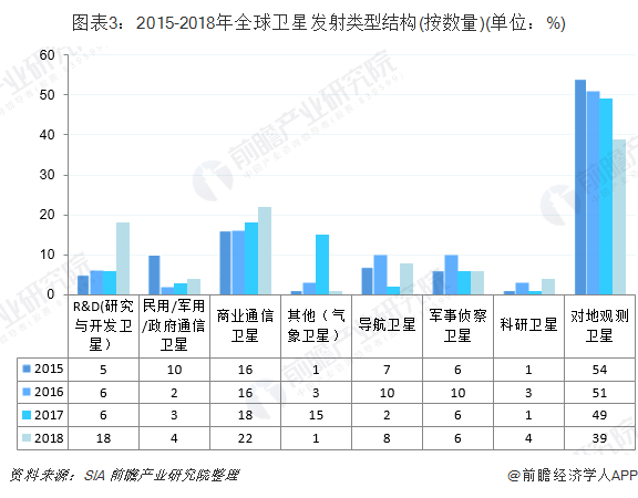 2018年全球卫星发射数量为314颗,其中导航卫星占比为8%,比重较2017年上升了6个百分点。