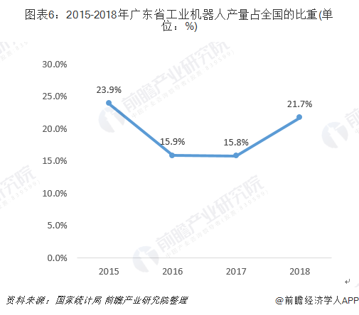 2018年,全国共生产工业机器人14.8万台(套),同比增长了,12.7%,而广东2018年工业机器人产量达3.21万台(套),同比增长了55.1%。换言之,2018年,广东工业机器人产量占全国总量约21.7%,增速也快于全国平均增幅。