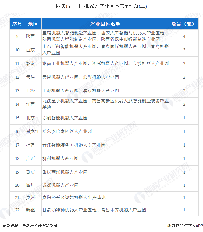 截至2017年年底,全国共有约50个机器人小镇或产业园区,截至2018年年底,已有74个机器人产业园区在建或已建成,其中广东省占据11个,占全国的比重14.9%。