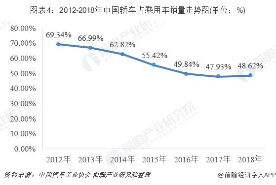 从市场份额占比来看,2012-2017年,我国轿车占乘用车销量的比重持续下降。从2012年占比69.34%下滑到47.93%,2018年中国轿车占汽车销量比重小幅回升,达到48.62%,比2017年上升0.69个百分点。