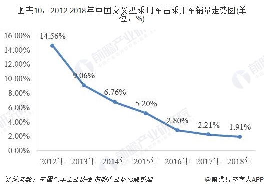 从市场份额占比来看,2012-2018年,我国交叉型乘用车占汽车销量的比重整体呈下降趋势。2012年,交叉型乘用车占乘用车总销量的比重为14.56%;到2018年,占比下滑至1.91%。7年间下滑了近12个百分点。