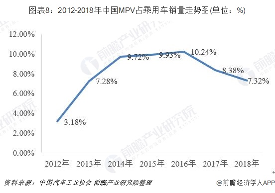 从市场份额占比来看,2012-2016年,我国MPV占乘用车销量的比重呈波动上升的趋势。2016年,MPV销量占乘用车总销量的比重为10.24%,为近年来最高值。2016-2018年,我国MPV占乘用车销量比重呈现出下降的比重,2018年,MPV销量占汽车总销量的比重为7.32%,较2016年下降近3个百分点。