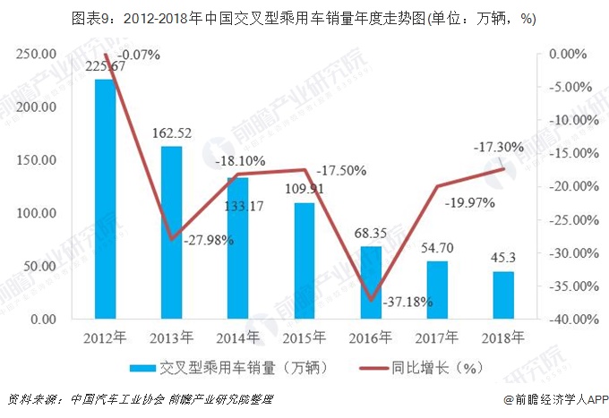据中国汽车工业协会统计分析,2012-2018年我国交叉型乘用车销售整体呈现下降趋势,连续7年负增长,2018年,我国交叉型乘用车销量为45.3万辆,较上期同比下降17.30%,销售下降的趋势还在继续。